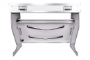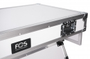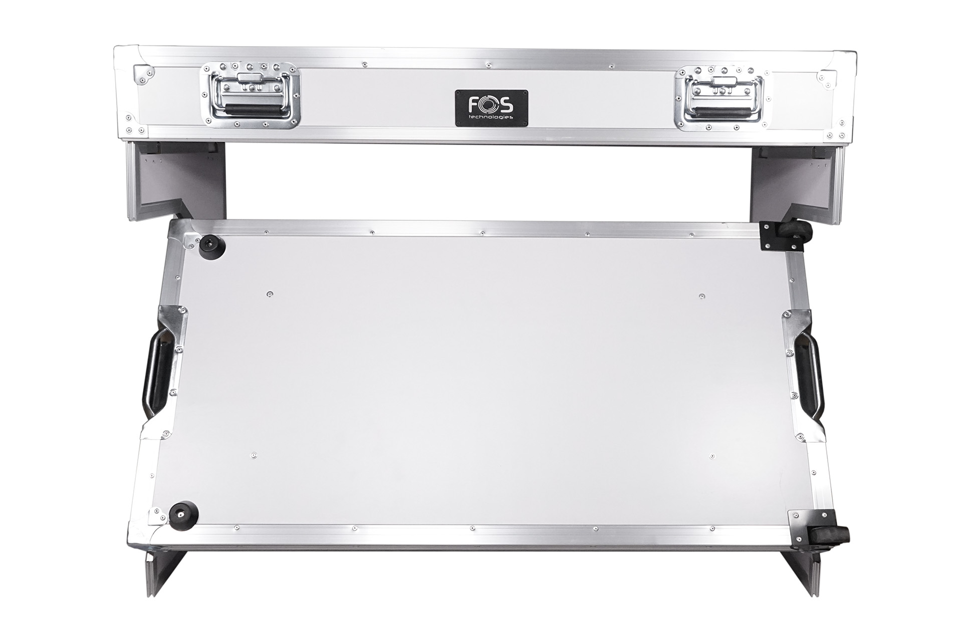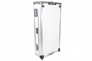 Foldable Z-style DJ table flight case with handles and wheels, rendering it highly portable, simple to set up, and easy to break down for DJs . Its durable construction from white plywood with handles and wheels.