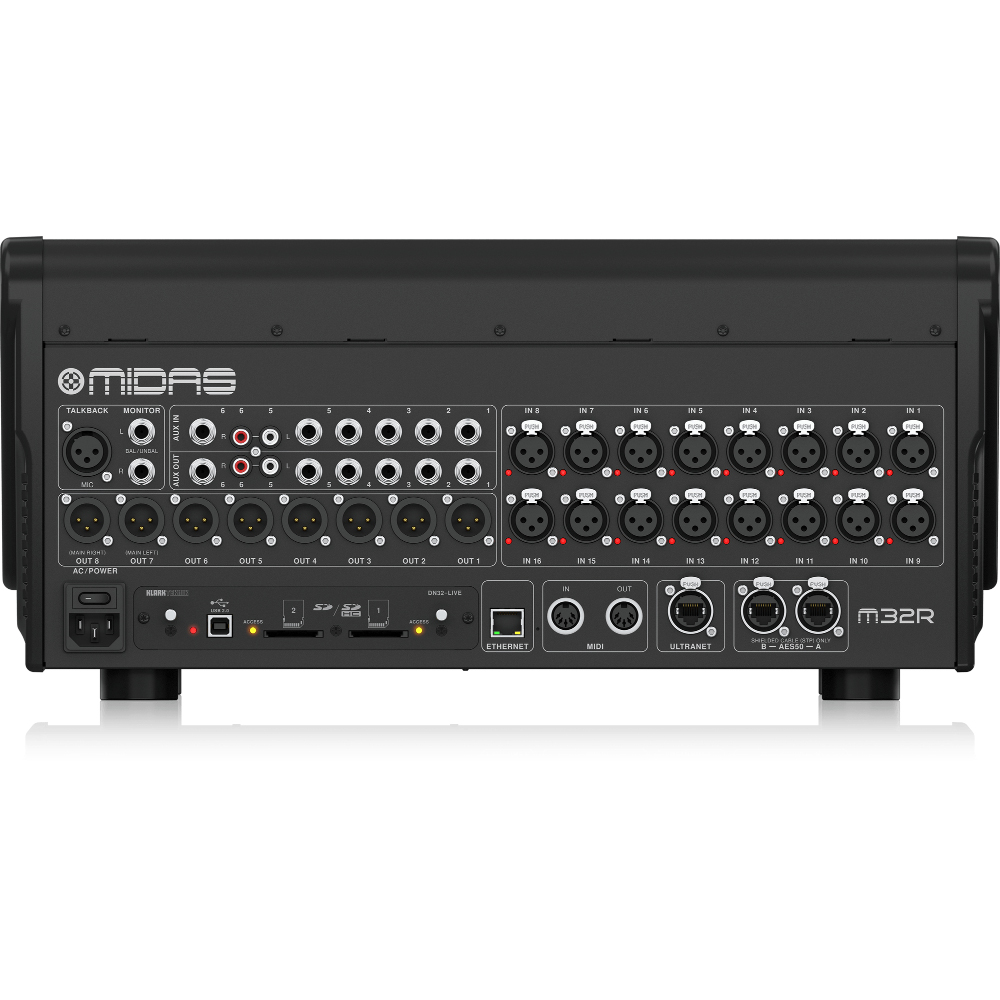 The Midas M32R Live is a 16x channel40x input compact digital mixing console. The M32R Live console combines legendary Midas sound quality with advanced rackmount digital technology. The M32R Live has up to 40x input channels. With 16x Midas Pro microphone pre-amps and 25x phase-coherent mix busses, the M32R Live is ideal for both live and studio applications. Numerous effects, routing and scene options make this console an extremely versatile companion, especially during sound checks. The compact 5″ TFT display provides a good overview of the digital console, giving detailed information on your current focus. In addition, the M32R console is equipped with an internal audio interface that enables a virtual sound check with 32x inputs/outputs. The Midas M32R Live can be controlled remotely using an iPhone/iPad and the Midas app, and the Klark Teknik DN32-LIVE module can be integrated into the M32R Live so that a further 32x bi-directional channels are available for live recording/playback on dual SD/SDHC (cards not included).